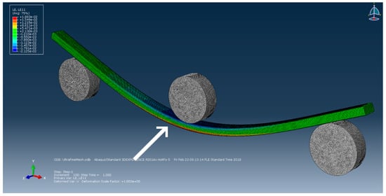 The finite element method was used for simulating the macroscale behaviour of the UD CFRP beam. The simulations allow experimental verification of the behaviour of a real component using the material constants obtained in the previous step. In addition, they give boundary conditions (BCs) and node displacements for the micromodel that are relevant to a real loading situation. The three-point bending setup used for experimental work was modelled and meshed in Abaqus CAE using quadratic tetrahedral (C3D10) elements (Figure 3). The rollers were defined as rigid shell bodies with Hertzian contact and a 0.15 friction coefficient [47]. Orthotropic material properties from the homogenised micromechanical model were used for material properties of the specimen. A load of 658 N was applied to the central roller, which corresponds to the forces seen in earlier experimental work [46]. In addition, cases with isotropic assumptions and a sensitivity analysis to individual material parameters was made. The results were compared to flexural tests according to ISO 14125 [48] and apparent interlaminar shear strength (ILSS) tests according to ISO 14130 [49]. Both bending experiments used the same MTS 810 testing system as the uniaxial tests.