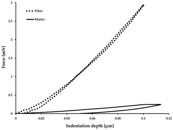 Loading/unloading curves of fiber and matrix from which indentation modulus is calculated.