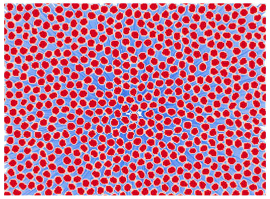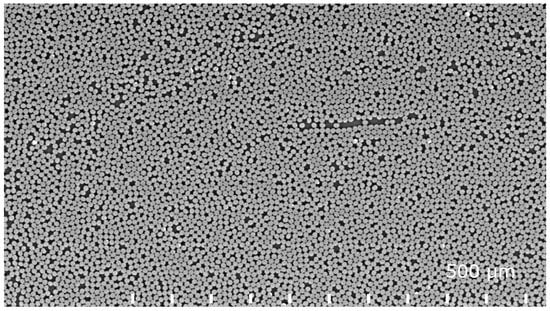 The microstructure obtained using electron microscopy (Figure 5) was processed algorithmically into a multiphase mesh. The fiber volume fraction was also obtained from the segmenting process. The fiber volume fraction was found to be 0.65, which corresponds to the fill ratio disclosed by the manufacturer. The introduced pores were characterized using light optical microscopy (Figure 6). The image shows clusters of multiple pores approximately 20 µm in diameter.