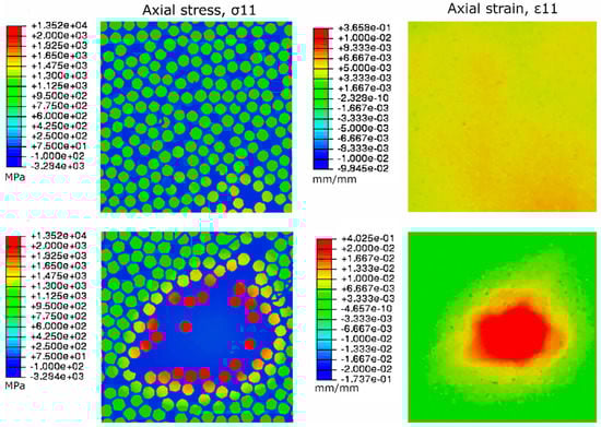 Comparison of reference microstructure (top) and resin-rich defect (bottom) in tension-dominated loading.