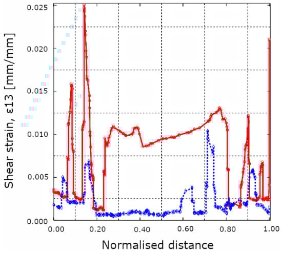 Line plots of the shear strains at the center (red) of the resin-rich microstructure and at the bottom (blue) in a shear-dominated load case.