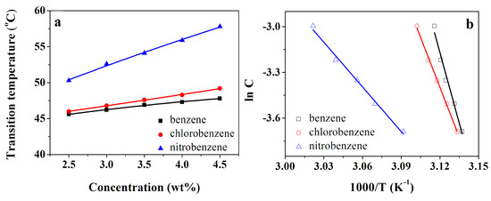 Using the Kamlet–Taft model, the hydrogen-bonding effect of solvents was found to be more precisely related to the gelation ability [32,33]. The Kamlet–Taft parameters [34] (polarity parameter (π*), hydrogen-bonding donating capacity (α), and accepting capacity (β)) of some related solvents are shown in Table 2. It appears that the hydrogen-bonding donating capacity (α) and accepting capacity (β) have an effect on gel formation. However, the polarity parameter π* demonstrates the most important role. Solvents with larger π* (nitrobenzene, methyl alcohol) hold a small gel–sol transition enthalpy (ΔHg). Furthermore, the solvents with small β values (toluene, o-xylene, m-xylene, benzene, chlorobenzene, and nitrobenzene) are associated with a large ΔHg. By comparison with other aromatics, the nitrobenzene solvents with both high π* and low β values had significantly smaller ΔHg values.