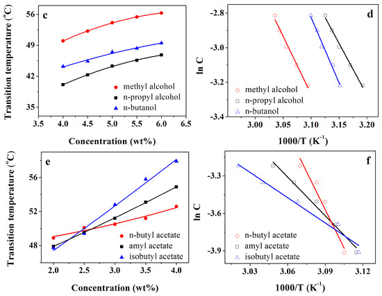 In the research, we investigated the thermal stabilities of gels formed by compound 4 using the “dropping ball” method [28,29]. The gel–sol phase-change temperatures (TGS) of compound 4 in aromatics, alcohols, and esters were increased with the increasing concentration of the gelators (see Figure 1a,c,e). It was evident that the status of the gels was mainly dependent on strong inter-molecular interactions. Thermodynamic information was extracted from these thermal experiments using the van ‘t Hoff equation (Equation (1)) [30,31]. The enthalpy (ΔHg) could be determined by plotting the relationship between the corresponding concentration (lnC) and the gel–sol transition temperature [(TGS)−1], as shown in Figure 1b,d,f. Table 2 summarizes the enthalpy values in specific solvents.