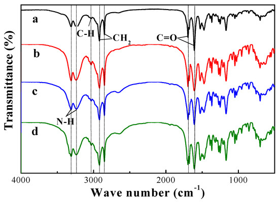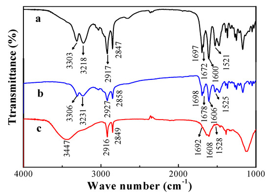 The structure of organogels was formed via hydrogen bonding and van der Waals forces [37], and the driving forces for gelation were evaluated by FTIR spectra [31,32,33]. The FTIR spectra of the xerogel, gel, and solution of compound 4 in CCl4 are shown in Figure 4. The IR spectrum of CCl4 gel (Figure 4b) shows the characteristic absorption peaks of H-bonded amide groups at 3306, 3231 (amide A), 1606 (amide I), and 1525 cm−1 (amide II). The characteristic infrared group frequency of the urethane group appears at 1697 and 1672 cm−1 in CCl4 xerogel, and 1698 and 1678 cm−1 in CCl4 gel. The characteristic infrared group frequency in CCl4 solution (Figure 4c), arising from non-hydrogen bonded amide groups, is at 3447 (νN-H, amide A), 1608 (δN-H, amide I), and 1528 cm−1 (amide II). The hydrogen-bonding between the amide groups and urethane groups causes a low-frequency shift in IR spectra [35,38]. The absorption bands of alkyl chains in CCl4 gel and antisymmetric and symmetric stretching vibrations appear at higher wave numbers than those of compound 4 in CCl4 xerogel or in CCl4 solution. It is suggested that compound 4 self-assembled into a nanostructure via inter molecular hydrogen-bonding [39,40]. Therefore, the CCl4 molecules were immobilized in the networks. The similar shape of IR spectra confirmed that the intermolecular structure was retained in the transition from CCl4 gel to xerogel. Thus, the hydrogen bonding was the major factor contributing to the formation of organogel.