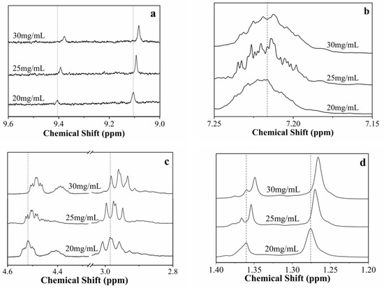 The driving forces of the gelation are the non-covalent bonds formed by intermolecular interactions, and the credible data of these weak interactions can be obtained from the NMR studies [41]. The self-assembly behavior of compound 4 in certain solvents was further confirmed by 1H NMR spectroscopy, as shown in Figure 6.
