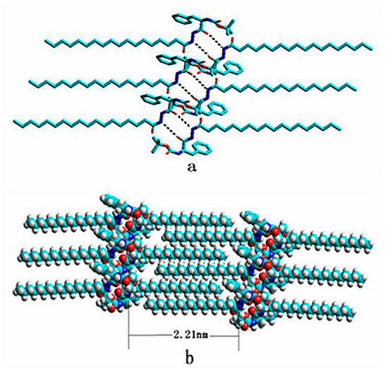 The results indicated that due to the intermolecular interactions, the gelators rearranged and formed an orderly network structure during the self-assembly process. The low-angle X-ray diffraction pattern of compound 4 xerogel in benzene shows periodical diffraction peaks, which indicates compound 4 self-assembles into an ordered supramolecular structure. The XRD pattern shows the that the largest Bragg distance was 2.21 nm, which was consistent with the length (2.213 nm) reported for the optimal model of a single compound 4 molecule, which was measured by HyperChem 8.0 using the semi-empirical method INDO and the Polak–Ribiere algorithm (based on the data of XRD). The molecules were docked by hydrogen bonding, and the simulation diagram of hydrogen bonding is shown in Figure 8a. According to results of FTIR and low-angle XRD, it could be confirmed that long alkyl chains of compound 4 molecules formed a fully expanded interdigitated layer structure during the self-assembly process. The possible stacking model is shown in Figure 8b. However, the processing to form a gel is very complex. The interaction between the gelators and the solvent molecules should be considered. Therefore, the simulation results are limited.