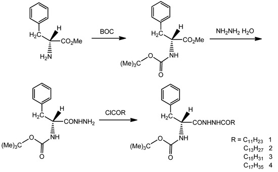 All of the starting compounds (methyl L-phenylalaninate hydrochloride (H–Phe–OmeCl), BOC, n-dodecyl chloride, n-tetradecanoyl chloride, n-hexadecanoyl chloride, and n-octadecanoyl chloride) were obtained from Yangzhou Baosheng Biochemical Co., Ltd. Hydrazine hydrate was purchased from Tianjin Bodi Chemical Co., Ltd. The solvents (such as methanol, alcohol, toluene, chlorobenzene) were obtained from Sinopharm Chemical Reagent Co., Ltd., and were of high quality, which allowed them to be applied without further purification steps. Some other materials were processed beforehand (purified, dried, or freshly distilled) to meet the experimental requirements.