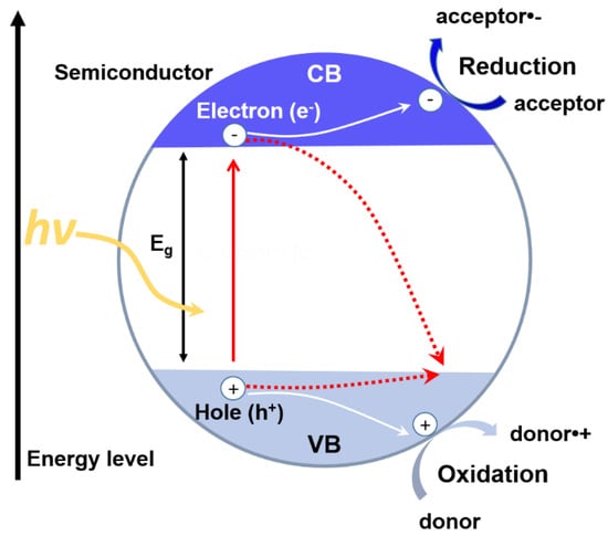 Schematic illustration demonstrating the photocatalytic process of a semiconductor photocatalysts. Adapted with permission from Reference [22]. Copyright (2011) Elsevier.