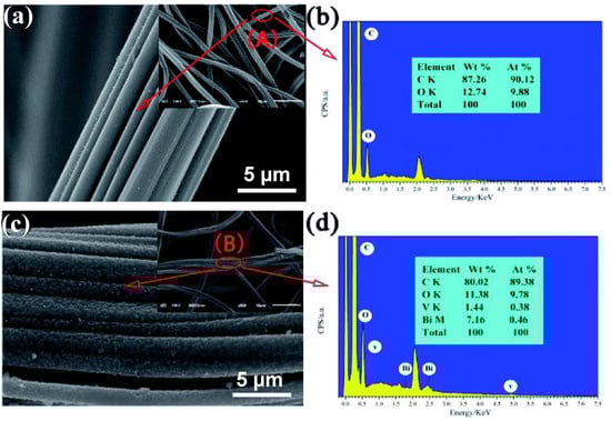 SEM images (a,b) and corresponding EDS spectra (c,d) original activated carbon fibers (ACFs) and BiVO4@ACFs. Adapted with permission from Reference [79]. Copyright (2018) Royal Society of Chemistry.