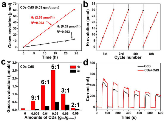 (a) Water splitting performance of the carbon dots (CDs)–CdS under visible light irradiation. (b) The cyclic stability of visible light photocatalytic water splitting performance of CDs–CdS. (c) The amount of produced gases of CDs–CdS with different content of CDs. (d) Photoresponse properties of pristine CdS and representative CDs–CdS. Adapted with permission from Reference [85]. Copyright (2017) Elsevier.
