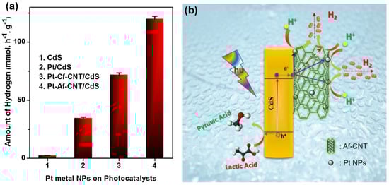 (a) Comparison of hydrogen production with Pt nanoparticle-loaded materials versus pure CdS. (b) Schematic illustration demonstrating mechanism of H2 production via photocatalytic water splitting by Pt–Af–CNT/CdS ternary composite. Adapted with permission from Reference [109]. Copyright (2018) Elsevier.