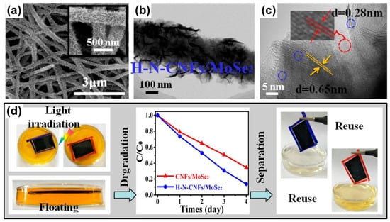 (a) SEM images, (b,c) Transmission electron microscopy (TEM) images of H–N–CNF/MoSe2 heterojunctions. (d) Digital photographs demonstrating the self-supporting photocatalysis application of H–N–CNF/MoSe2 and CNFs/MoSe2. Adapted with permission from Reference [124]. Copyright (2018) American Chemical Society.