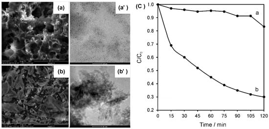 (a,b) SEM, (a’,b’) TEM of pristine GQDs and NiAl2O4/GQDs composite, respectively. (c) Photodegradation performances of NiAl2O4 (line a) and NiAl2O4/GQDs composite (line b) over the Rhodamine B (RhB). Adapted with permission from Reference [136]. Copyright (2019) MDPI AG.