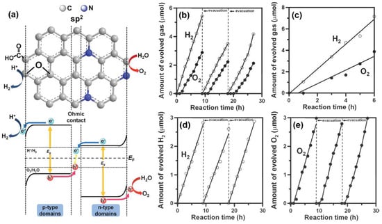 Besides, GO could also be utilized for the synthesis of photocatalysts. Our group recently reported the fabrication of a GO/BiOCl/PAN composite by a combination of the solvothermal and electrospinning methods. The composite photocatalyst had a fibrous structure and the presence of GO led to a nearly three-fold enhancement of the photocatalytic degradation activity of the organic pollutants in water, as compared with that of the pristine BiOCl/PAN fibers [137]. Moreover, graphene can be directly used as a photocatalyst. For example, Yeh et al. [138] reported the synthesis of nitrogen-doped graphene oxide quantum dots (NGO–QDs). In their study, GO was pretreated with NH3 to incorporate nitrogen elements into the structure of graphene to obtain nitrogen-doped graphene oxide (NGO). Subsequently, NGO was used as a precursor to prepare NGO–QDs via a modified Hummer’s method. Then, the photocatalytic performance of the obtained NGO–QDs under irradiation with visible light was investigated. As shown in Figure 8a, the nitrogen atoms introduced into the graphene frame led to the formation of p–n type photochemical diodes in the NGO–QDs, resulting in n-conductivity. Meanwhile, the presence of oxygen on the graphene surface resulted in p-conductivity. As a result, the NGO–QDs exhibited intriguing visible-light photocatalytic water splitting performance compared with the other photocatalysts (Figure 8b–e). Moreover, the meta-free characteristics of the NGO–QD catalyst make it more sustainable from environmental and economic viewpoints. To summarize, the presence of graphene favored the design and synthesis of novel photocatalysts, which is one of the most promising developmental directions for photocatalysts.