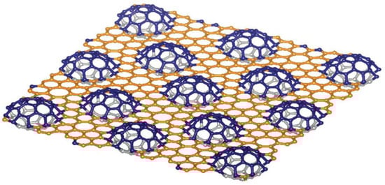 Considering that there are many types of C allotropes, some other carbon nanomaterials, such as fullerene (C60), could also be utilized as an effective component for the synthesis of novel photocatalysts because of its unique electronic properties [22]. C60 is an excellent electron acceptor that can accept six electrons owing to its relatively low-energy LUMO (lowest unoccupied molecular orbital) and high state degeneracy [139]. Therefore, coupling C60 with various semiconductors to form C60/semiconductor composite photocatalysts has been well studied. For example, Li et al. [39] synthesized a C60/Bi2TiO4F2 composite photocatalyst via a facile solvothermal method for the visible light photocatalytic degrading of organic pollutants in water. They demonstrated that C60 clusters were well dispersed on the surface of Bi2TiO4F2 to form strong heterojunctions. Therefore, the electron transfer rate and the charge carrier separation efficiency of the photocatalyst were significantly enhanced and C60 could further improve the light adsorption capability of the C60/Bi2TiO4F2 composite. As a result, the obtained composite photocatalyst exhibited remarkably enhanced activity under visible-light irradiation. On the other hand, the fullerene derivatives could also be utilized to improve the photocatalytic performance of semiconductors. For example, Echegoyen et al. [140] recently explored the application of porphyrin/phthalocyanine fullerene complexes in a photocatalytic system with TiO2. In their study, the bis(4-pyridyl)pyrrolidinofullerene was used as a dual ligand for a supramolecular approach to attach porphyrins and phthalocyanines on the surface of TiO2 to make it sensitized. The synthesis of the composite was based on a simple sol-gel method. As expected, the obtained composite exhibited intriguing photocatalytic activity under the irradiation of solar light, which was attributed to the enhancement of electron transfer to the CB of the corresponding semiconductor. More recently, Liu et al. [141] demonstrated a facile strategy to fabricate a novel 2D carbon material that combined the structures of fullerene and graphene by embedding bubble carbon structures in the graphene lattice (Figure 9). They claimed that by regulating the percentage of sp3 carbon and the strains caused by the curvatures of the bubbles, a tunable electronic structure ranging from metallic to semiconducting with sizable gaps can be created in the material. Therefore, this method is a promising tool to create novel carbon-based photocatalysts.