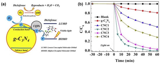 (a) Schematic illustration showing the visible light-induced photocatalytic degradation of organic compounds over CQD-modified g-C3N4. (b) Photocatalytic degradation kinetics of diclofenac by different photocatalysts. Adapted with permission from Reference [155]. Copyright (2019) Elsevier.