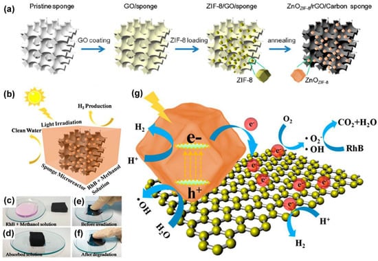 (a,b) Schematic illustration of the fabrication process and photocatalytic reaction in ZnO nanocages/rGO/carbon sponge (ZRCs)-based microreactor. (c–f) ZRCs absorption and in-situ photocatalytic degradation of RhB/methanol aqueous solution. (g) Schematic illustration demonstrating the mechanism of simultaneous sunlight-driven photocatalytic degradation of RhB and H2 production. Adapted with permission from Reference [167]. Copyright (2018) American Chemical Society.