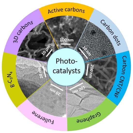 Thus far, a variety of strategies, such as coupling semiconductors with carbon [22,23,24], introducing co-catalysts [25,26,27], and constructing heterojunctions [28,29,30], have been developed to further improve the performance of photocatalysts. Among which, carbonaceous materials play important roles in the design and synthesis of novel photocatalysts as they have the advantages of good electron conductivity, large surface area, excellent physicochemical stability, and facile synthesis approaches [22]. In general, the micro/macro morphologies and crystal structures of carbonaceous materials could be well regulated, so that these materials can be facilely synthesized according to the specific requirements of different applications. Up to now, a great deal of photocatalysts based on carbonaceous materials with various structures and compositions have been developed. The most widely used carbonaceous materials for the synthesis of photocatalysts are activated carbons, carbon dots, carbon nanotube/nanofiber, graphene, fullerene, and three-dimensional (3D) carbons. Moreover, as a carbon-rich and metal-free photocatalyst, graphitic carbon nitride (g-C3N4) has also attracted great research attention due to its appealing bandgap property, high physicochemical stability, facile synthesis approach, and “earth-abundant” nature [31,32,33,34]. Owing to the attractive features of carbonaceous materials for photocatalytic applications, there have been many outstanding studies focusing on the development of photocatalysts deriving from carbonaceous materials [22]. Therefore, a timely summary and discussion of the recent progresses on carbonaceous photocatalysts is required. Moreover, the influence of the morphology and composition of the carbonaceous materials on the photocatalytic process must be analyzed, as this knowledge is important for the design and synthesis of new carbonaceous photocatalysts.