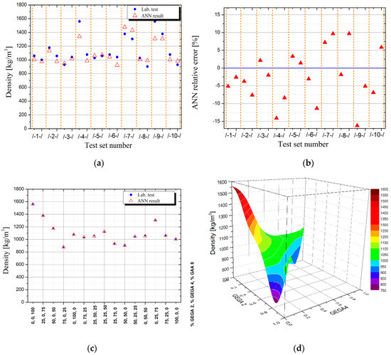 Illustration of results obtained using artificial neural networks (ANN) for density of lightweight concrete (LWC) as a function of GEGA 2 mm and GEGA 4 mm shares in the specimen, (a) results generated by ANN for individual testing datasets (b) relative error of ANN for individual testing datasets (c) comparison of measurement results with values obtained by ANN for training database (d) values of density of LWC predicted by ANN for intermediate points between measurement data from the training dataset.
