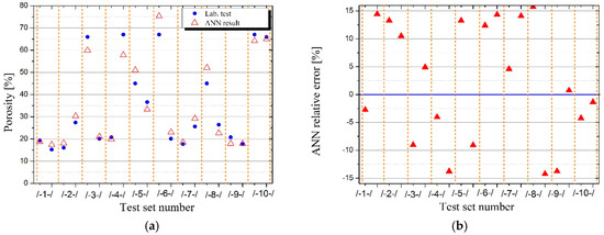 Next, data from the appropriate testing set were fed to the input of the already trained ANN, and the relative error of ANN was calculated (the sum of the squares of differences between the actual output values (laboratory results) and those, calculated by the network (generated during the prediction), divided by actual output values). This procedure was repeated for the determined architecture of the ANN for each of the 10 previously prepared different training datasets and corresponding testing datasets. This way ANNs of different number of neurons in hidden layers could be compared. The number of neurons in the first hidden layer varied from 2 to 12, and in the second hidden layer from 2 to 17. ANNs with fewer neurons than mentioned above were disqualified, and ANNs with more neurons or larger number of layers did not significantly improve the results, while increasing only the calculation time. The smallest total relative square error for 10 testing datasets during the prediction of density was achieved by the ANN of 2-11-15-1 architecture, i.e., 2 input neurons (shares of GEGA 2 mm and GEGA 4 mm in the specimen), 11 neurons in the first hidden layer, 15 neurons in the second hidden layer and one output neuron (density). In the case of strength and porosity, the best result was achieved by the ANN also of the 2-11-15-1 architecture.