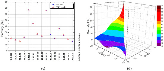 Illustration of the results, obtained by means of using ANN for porosity of LWC as a function of GEGA 2 mm and GEGA 4 mm shares in the specimen, (a) results generated by ANN for individual testing datasets (b) relative error of ANN for individual testing datasets (c) comparison of measurement results with values obtained by ANN for training database, (d) values of porosity of LWC predicted by ANN for intermediate points between measurement data from the training dataset.