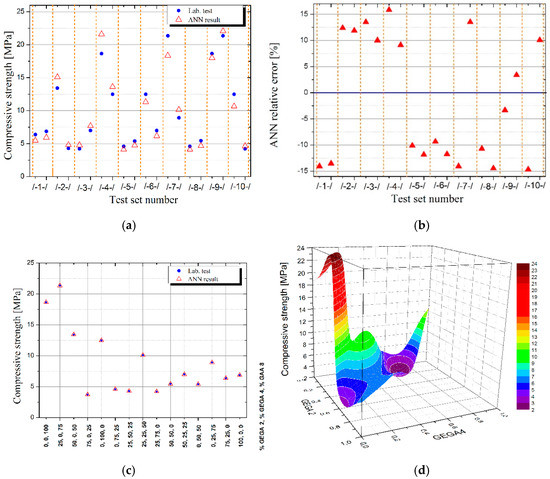 Illustration of the results, obtained by means of using ANN for compressive strength of LWC as a function of GEGA 2 mm and GEGA 4 mm shares in the specimen, (a) results generated by ANN for individual testing datasets (b) relative error of ANN for individual testing datasets (c) comparison of measurement results with values obtained by ANN for training database, (d) values of strength of LWC predicted by ANN for intermediate points between measurement data from the training dataset.