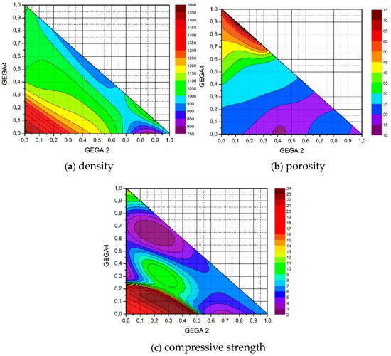 Projections of 3D charts on the plane of the shares of GEGA 2 mm and GEGA 4 mm in a specimen of LWC. Results, generated by ANN (prediction) (a) for density, (b) for porosity, (c) for compressive strength. The charts enable the choice of shares of individual aggregates in the concrete to optimize a few criteria, e.g., the lightest weight concrete of maximum strength.
