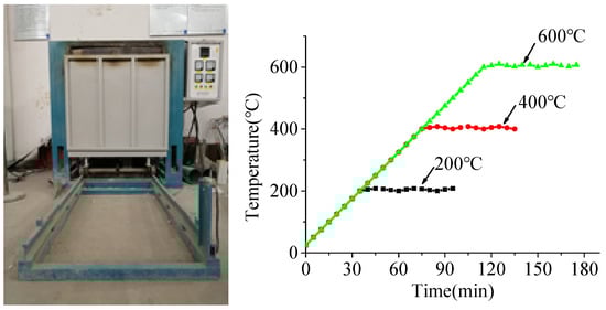 An electrical furnace, 80 cm × 80 cm in cross section and 110 cm in height, was used to simulate the fire situation, as shown in Figure 1. The heating rate was 5 °C/min in this experiment, which was controlled automatically by adjusting the electric current. After heating to the target temperature (200, 400 and 600 °C), the temperature was maintained for 60 min, as shown in Figure 1. Then, the specimens were cooled down naturally and removed from the furnace until the temperature of the furnace chamber decreased to 100 °C to avoid thermal shock caused by a large cooling rate.