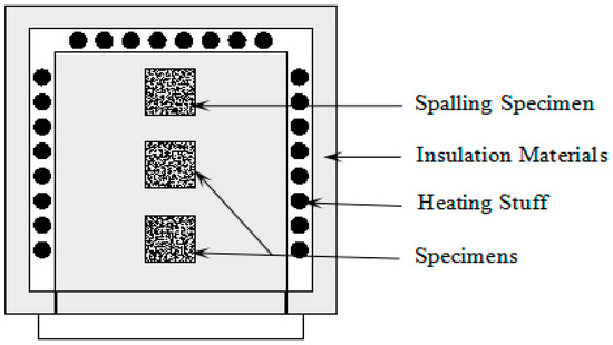 The spalling of concrete generally occurs when it is exposed to elevated temperatures or mixed by lower w/c ratios. When the temperature is below 300 °C or the w/c ratio is higher than 0.32, the spalling of concrete rarely occurs [36]. When subjected to elevated temperatures, many randomly distributed cracks were formed inside and on the surface of the concrete. The occurrence of spalling depends on whether the crack space is sufficient enough to release the pore pressure [37]. When the pore pressure cannot be completely released in the crack, the concrete will spall after reaching the critical strength condition [38,39]. A spalling occurred during this experiment, which can be attributed to two points. First, the w/c ratio of this specimen was just 0.34, resulting in a denser internal structure of concrete. When exposed to an elevated temperature, it is difficult for vapor to move out from concrete into the atmosphere. The vapor pressure, which causes cracks in concrete, comes into being. When the temperature came to a certain level, the tensile stress of the concrete could not resist the pore pressure, and the spalling of concrete occurred. Another cause was that the specimen was located at the innermost part of the furnace, as shown in Figure 5. Thus, its surface temperature was higher than the other two specimens.