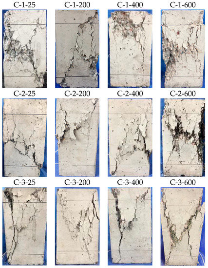 In the case of the C-1 group, when the mechanical load reached about 70% of the peak value, cracks on the reference specimen began to appear near the top left corner. With the load increase, the cracks continued to grow, and some new, fine cracks appeared. They then developed towards the specimens’ end, producing a slant crack map. At the descending stage, several small pieces of concrete peeled off. At temperatures of about 200 °C and 400 °C, the effect of elevated temperature on the sequence of failure progression was not significant, except that the bearing capacity decreased slowly. When exposed to a temperature of 600 °C, more fine cracks appeared on the concrete surface, and concrete spalled off at an early period. The same situation can be observed in the C-2 and C-3 groups, as shown in Figure 7.