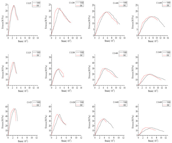 In Figure 8, the black line represents the result of the YHD displacement meter, and the red line represents the result calculated by DIC. Out of the three samples tested, the test result of the specimen which replicated the average behavior was used for the comparison of behavior with respect to different temperatures. By comparing the results of DIC and YHD displacement meters, we found that they were in good agreement in the elastic phase, and the difference between them increased gradually with the increase of pressure at all specimens. This phenomenon was evident in group C-3, and the largest difference (40%) in peak strain—measured by the displacement meter and DIC—occurred in this group. Because of the dense internal structure, more cracks were formed after exposure to elevated temperature, and the surface concrete was more prone to fall off during the loading process.