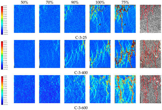 Figure 9 below shows the full field strain distribution of the specimen subjected to various temperatures at different load levels. From left to right, the principal strain distribution of 50%, 70%, 90%, 100% and 75% (in the descending stage) of the peak bearing capacity are presented in the figure. DIC technology can obtain the strain of the specimen surface in the full-filled distribution at any stage of the loading process. When the temperature was below 400 °C, the distribution of the surface strain of the concrete had obvious regularity. The DIC technique can clearly draw the high tension areas, even if no cracks were formed on the surface. With the increase of pressure, these regions gradually formed cracks and even concrete spalling. When heated to 600 °C, the strain distribution on the concrete surface was sporadic. It can be seen that temperature has a serious and irreversible effect on concrete. However, the strain distribution at this region cannot be provided when the surface concrete falls off, as shown in Figure 9 for the C-3-600 specimen. This may also limit the range of application of DIC.