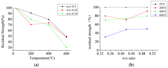 Figure 6b shows the effect of the w/c ratio on the weight loss of the concrete specimens. From Figure 6b it can be observed that as the w/c ratio increased, there was an increase in the percentage of weight loss within 400 °C. After heating to 600 °C, there were no obvious differences among the three types concretes. This can be attributed to the fact that weight loss below 400 °C is mainly due to the evaporation of water, and above 400 °C is mainly due to the decomposition of C–S–H and (Ca(OH)2) [40]. From the observation above, it can be found that the w/c ratio had less effect on weight loss than temperature.