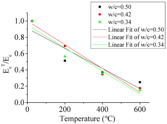 Figure 11 shows the effect of the w/c ratio and temperature on the elastic modulus. The values of the elastic modulus of specimens were the secant modulus at 40% of the peak stress from the experimental compressive stress–strain curve of YHD. It can be seen from Figure 11 that the trends in the loss of relative elastic modulus (EcT/Ec) with and increasing temperature were similar in the three different w/c ratio specimens. When the temperature reached 600 °C, the relative elastic moduli were about 20% of the original unheated specimens. The effect of the w/c ratio on the elastic modulus of concrete was obvious after heating to 200 °C. The different w/c ratios resulted in different free water content, causing various void pressures at the concrete interiors under elevated temperatures, which caused many fine cracks. When the temperature reached 400 °C or above, the effect of the w/c on the elastic modulus was not obvious. In this temperature range, the decrease in the elastic modulus was mainly due to the deterioration of the microstructure and chemical changes, which can be used to explain the above phenomenon.