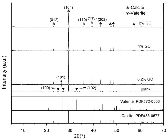 XRD patterns of calcium carbonate (CaCO3) crystals prepared with different content of graphene oxide (GO).