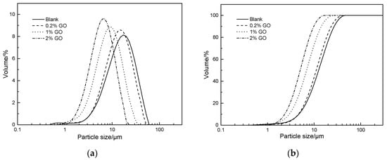 Particle size distribution of CaCO3 prepared with different dosages of GO: (a) Differential distribution, and (b) integral distribution.