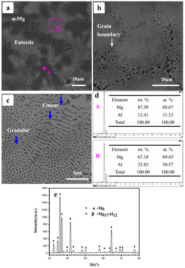 The cast Mg–Al alloy’s microstructure: (a) Cast Mg–Al alloy; (b) SEM image of eutectic structure at high resolution; (c) linear and granular like α-Mg phases in eutectic; (d) EDS analysis results at sites A and B in the SEM image (a); (e) the Mg–Al alloy’s XRD test result.
