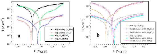 Polarization curves of (a) the Mg–Al alloy and SP Mg17Al12 in H2SO4 and HAc solutions and (b) pure Mg, SS AZ61, and SS AZ91 in H2SO4 and HAc solutions, respectively.