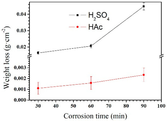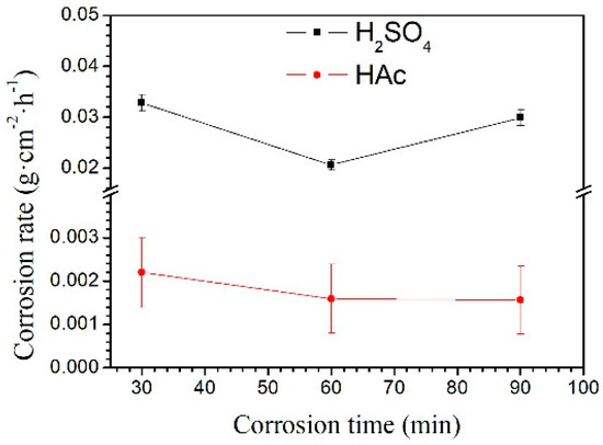The weight loss rate of the Mg–Al alloy in H2SO4 solution is shown in Figure 3. The weight loss rate is not linear with the corrosion time. Within the corrosion time range of 30–60 min, the weight loss rate increases slowly. However, it increases rapidly in the range 60–90 min. When specimens were immersed in HAc solution, the weight loss rate is linear to the corrosion time. In the experiment, the weight loss rate reflects the weight change per unit area; by contrast, the corrosion rate, shown in Figure 4, is a better reflection of the corrosion speed for a specimen. In the first 30 min, specimens had a higher corrosion rate than that after 60 min immersion in H2SO4 solution. However, with the prolong of corrosion time to 90 min, the corrosion rate increased again. In HAc solution, the specimens exhibit a steady corrosion rate.