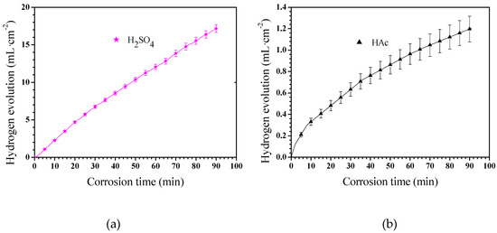 The average corrosion rates can be assessed by hydrogen evolution [31]. In this investigation, the hydrogen evolution volumes of specimens in H2SO4 solution were recorded once every minute because of the low pH of the corrosive medium. The hydrogen evolution rate of the specimen in HAc solution was lower, and the total hydrogen volume was recorded once every 2 min. The corrosion rate was obtained from the following formula: