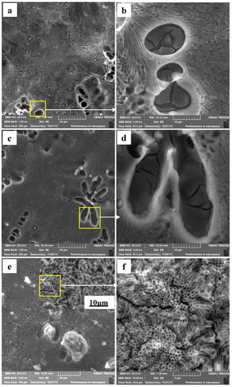 The corroded Mg–Al alloyspecimen’s corrosion morphologies gained from H2SO4 solution for different immersion times: (a,b) 30 min; (c,d) 60 min; (e,f) 90 min.