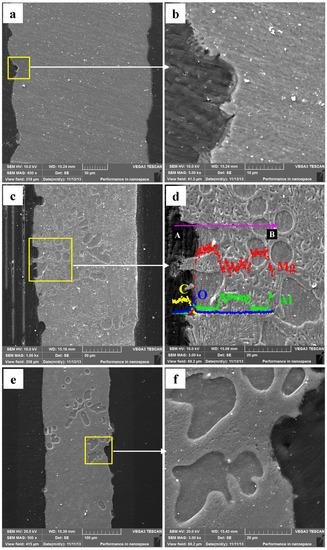 The corroded Mg–Al alloy specimen’s cross-sectional morphologies obtained from H2SO4 solution for different immersion times: (a,b) 30 min; (c,d) 60 min; (e,f) 90 min.