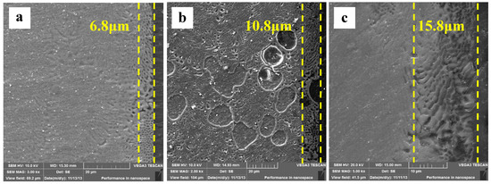 After immersing specimens in HAc solution for 30 min, the cross-sectional morphologies are characterized (Figure 9a). There are obvious differences in cross-sectional morphology between Figure 9a and Figure 8. First, the specimen surface remains smooth, is slightly corroded, and is not like the uneven one shown in Figure 9a. Second, the enlarged detail shows that the α-Mg dendrites as well as the α-Mg phase of the eutectics are both corroded, with only the Mg17Al12 framework left. The results show that the corroded depth, measured by line scanning, is extended about 6.8 μm to the deeper matrix. The Mg content in the corroded layer increases from the surface to the interior of the specimen, which indicates that the α-Mg phase in the eutectics is not corroded completely throughout the layer. In other words, the degree of de-alloying is not complete in the 6.8 μm thick layer. With the immersion time prolonged to 60 min, the specimen surface is still smooth. The corroded depth is increased to 10.8 μm (Figure 9b). Some deeper pits form at the original α-Mg dendrite sites owing to their poor corrosion resistance. The maximum depth of these pits reaches 40 μm, which can be demonstrated by the resin in these pits. With the immersion time increased to 90 min, the corrosion depth is up to 15.8 μm (Figure 9c), approximately 10 μm of which is a completely de-alloyed layer. Overall, the corroded depth at the sites of the α-Mg dendrites is deeper than that in the eutectic regions. During immersion testing, the original Mg17Al12 framework is preserved, which suggests that the Mg–Al alloy is corroded in a selective form in HAc solution.