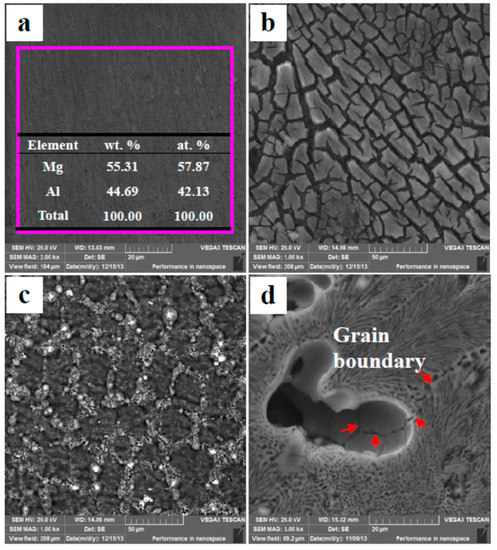 There are two phases in the Mg–Al alloy, α-Mg and Mg17Al12. The β-Mg17Al12 is a cathode phase in microstructure, so the corrosion behavior of the whole specimen is significant affected by the α-Mg. The original morphology of cast Mg17Al12 is shown in Figure 10a. The EDS results are consistent with the ideal composition of the Mg17Al12. After immersion for 90 min in H2SO4 solution, many cracks occur on the Mg17Al12 specimen surface, and some fragments detach from the matrix (Figure 10b), which illustrates that the SP Mg17Al12 do not have sufficient resistance to corrosion in H2SO4 solution. Despite that the β-Mg17Al12 phase has a relative high Al content and an Al-rich film forms on the specimen surface, these advantages cannot hinder corrosion. Al2O3 is an amphoteric oxide and is not stable in H2SO4 solution. When the Mg–Al alloy is immersed in H2SO4 solution, Al-rich films also form on the α-Mg dendrite surfaces (Figure 8d). As a result, a corrosion attack occurs at nearly the same time over the whole specimen surface (Figure 8), although the two phases in the alloy show a great difference in corrosion potential. The corrosion occurs in the α-Mg dendrites only a little earlier than that in the β-Mg17Al12 phases (Figure 8c,d).