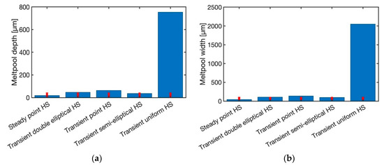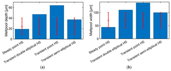 Predicted melt pool (a) depth and (b) width using transient moving point HS.