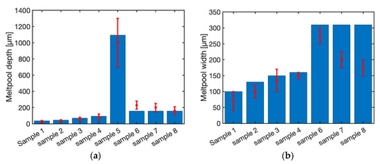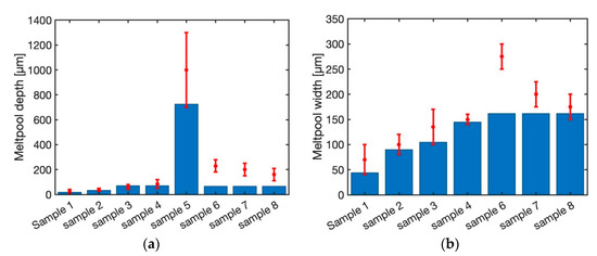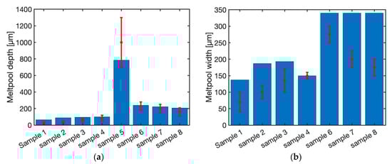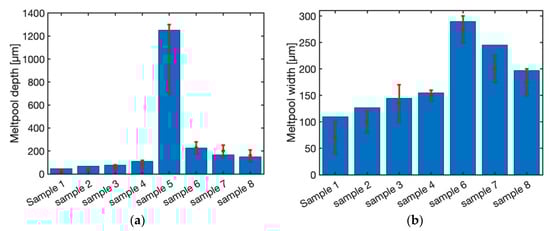 Figure 10 depicts the melt pool depth and width using the transient moving point heat source approach. The melt pool depth is well captured using this approach for all the samples. Moreover, predicted melt pool width for the first four samples (sample 1 through 4) are predicted with the maximum error of 15%. The predicted melt pool width for sample 6 through 8 does not change. This is due to the existence of the exponential term in the modeling of the temperature field using the transient moving heat source approach, as explained before. As a result, the transient moving point heat source approach could not be used for the prediction of the temperature field at high speeds.