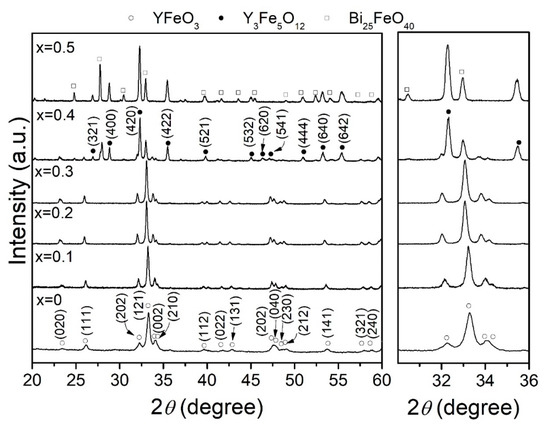 - Van Hook, H.J. Phase Relations in the System Fe2O3-Fe3O4-YFeO3 in Air. J. Am. Ceram. Soc. 1961, 44, 208–214. [Google Scholar] [CrossRef]