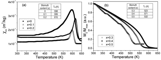 | Bi3+ Doping Concentration (x) | Ms at 18 kOe (emu/g) | Mr (emu/g) | Hc (Oe) | χm (×10−7 m3/kg) |