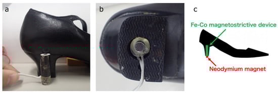 Integrated position of Fe–Co magnetostrictive device into a hollowed heel of the left pump. (a) side view, (b) bottom view, and (c) schematic illustration of Fe–Co magnetostrictive fiber integrated shoe.