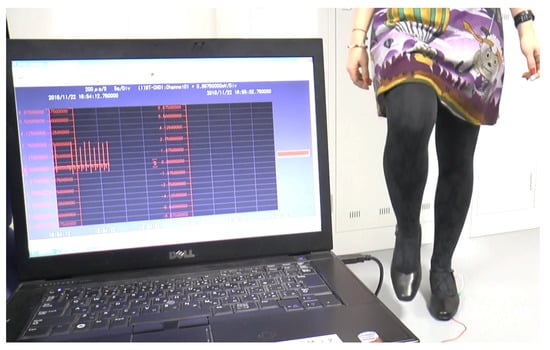 The Fe–Co magnetostrictive device was connected to a resistance of 20 Ω, which agrees with the value of the device (19.7 Ω) to optimize output voltage and a data logger in parallel. Note that the input resistance value of the data logger was 14.5 MΩ. The output power was evaluated from a voltage and a resistance during two different ambulation activities of two subjects. Figure 3 shows the output power evaluation appearance during the usual walking of subject 1.